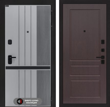 Отделка снаружи=’Фрезерованная МДФ панель 10 мм, цвет «Velluto Grigio» с патиной и вставкой из металла в цвет наличника’