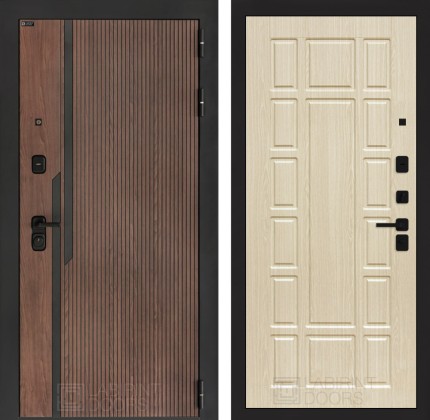 Отделка снаружи: Фрезерованная МДФ панель 10 мм, цвет «Орех американский» с патиной и вставками из металла в цвет наличника