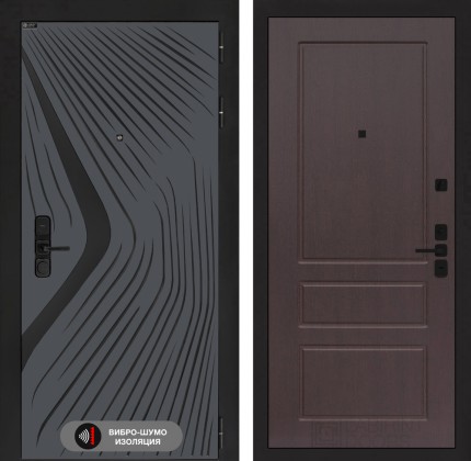 Отделка снаружи: Фрезерованная МДФ панель 10 мм, цвет «Velluto Oscuro» с патиной и вставкой из металла в цвет наличника
