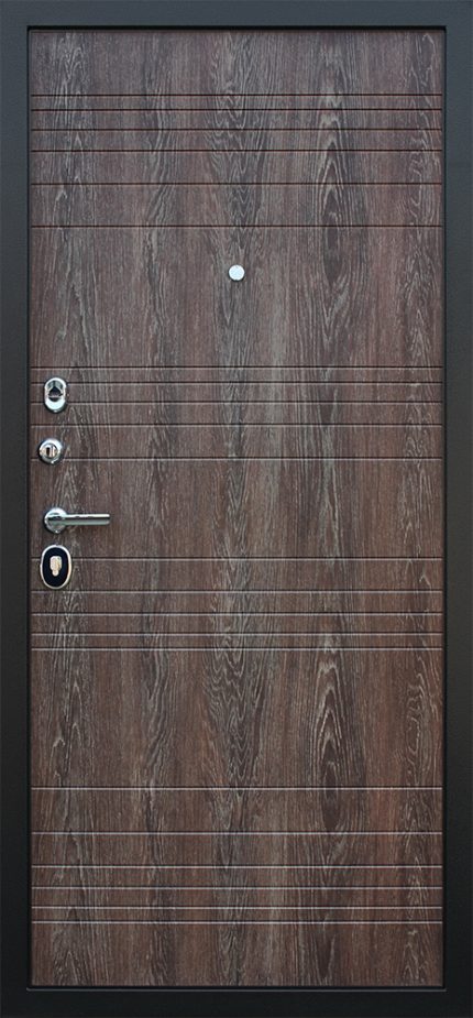 Представляем новинку от «АСД» ― модель «Эталон», сочетающую новые дизайнерские решения и наш многолетний опыт производства стальных дверей. Наружный лист (1,5 мм) отделан панелью МДФ в строгом цвете «8041-80 дуб фактурный горький шоколад», внутреннее полотно отделано экошпоном в элегантном цвете «бетон темный». Безопасность модели обеспечивают два замка «Гардиан» и стальная броненакладка. Благодаря качественному утеплению «Эталон» не только защитит ваш дом от недоброжелательных гостей, но и сделает его более комфортным.