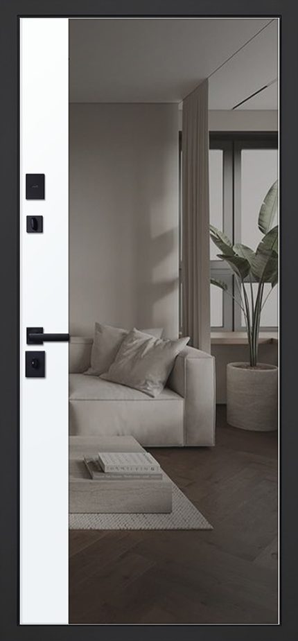 «Vertu» с зеркалом — дверь, которая работает за троих: держит тепло, гасит шум и надежно защищает дом и при этом еще экономит место в вашей прихожей за счет зеркала, встроенного во внутреннюю панель . Усиленная коробка, ребра жесткости и петли на подшипниках — фундамент ее долговечности. Подходит и для квартиры, и для загородного дома, если в нем предусмотрен теплый тамбур.