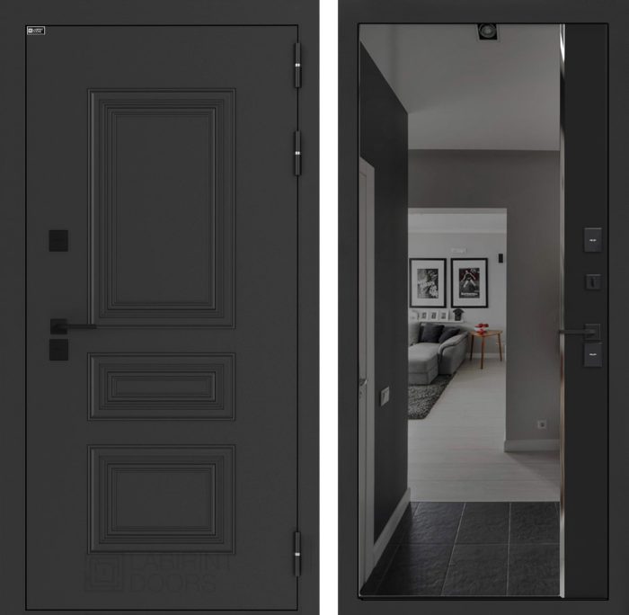 Входная дверь Аляска Лайт с зеркалом Панорама с тонировкой — Черный кварц