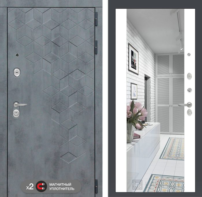 Входная дверь Бетон с Зеркалом Фацет - Белый софт