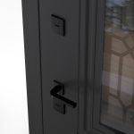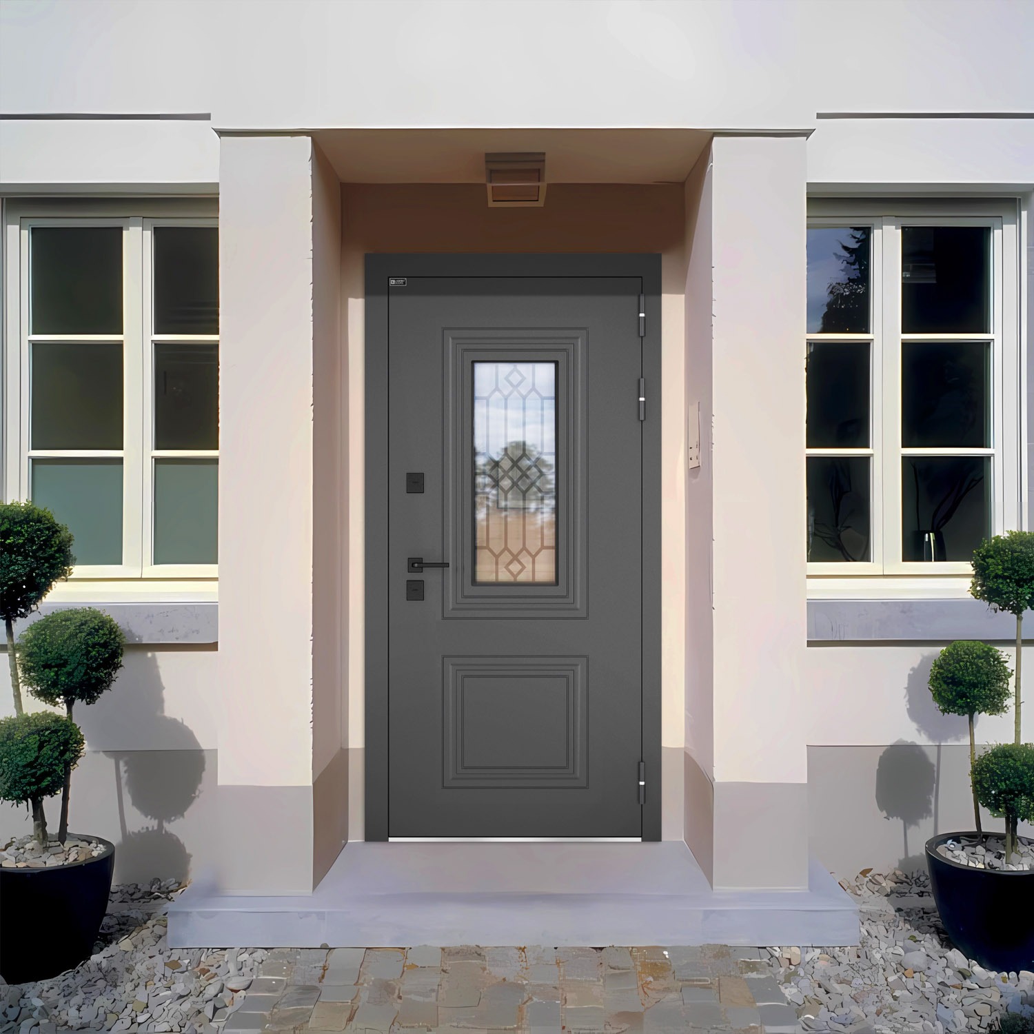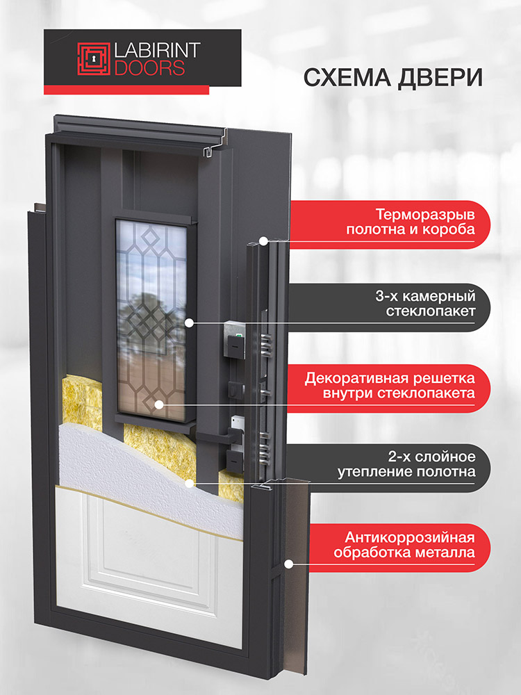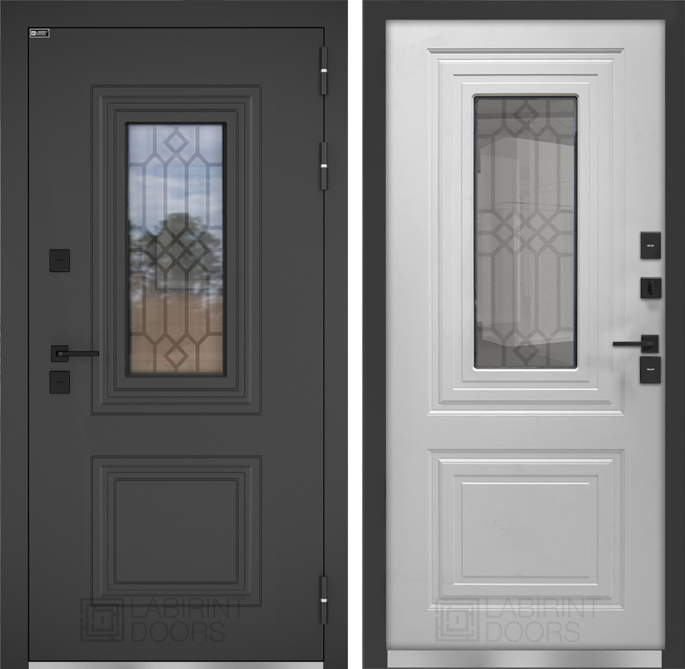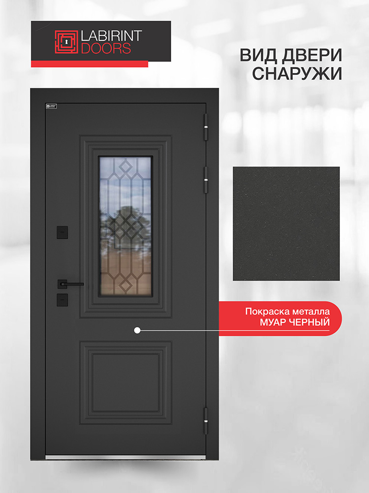 Стеклопакет: 3-х камерный стеклопакет 81 мм, снаружи тонированное стекло графит, внутри зеркальное серебро. Лазерная решетка внутри стеклопакета (муар черный)
