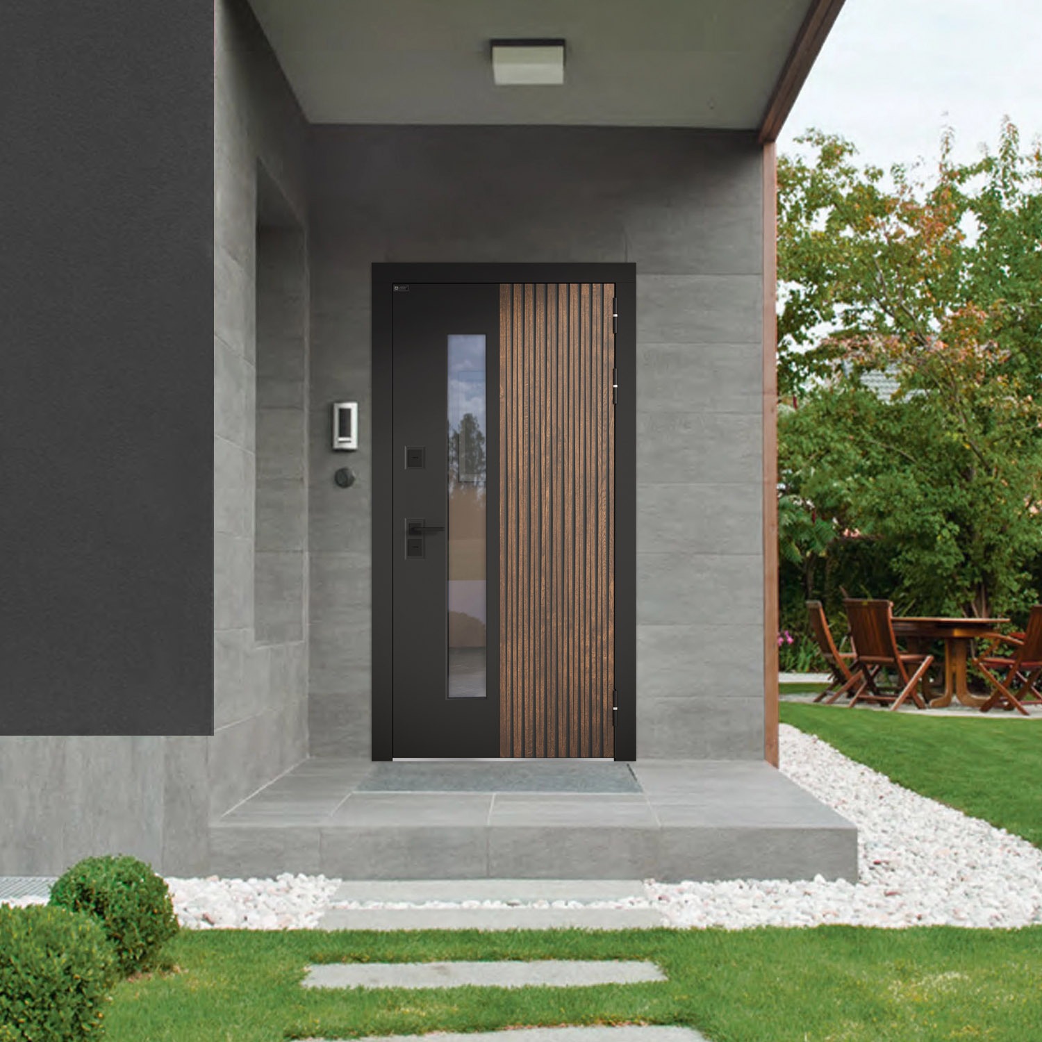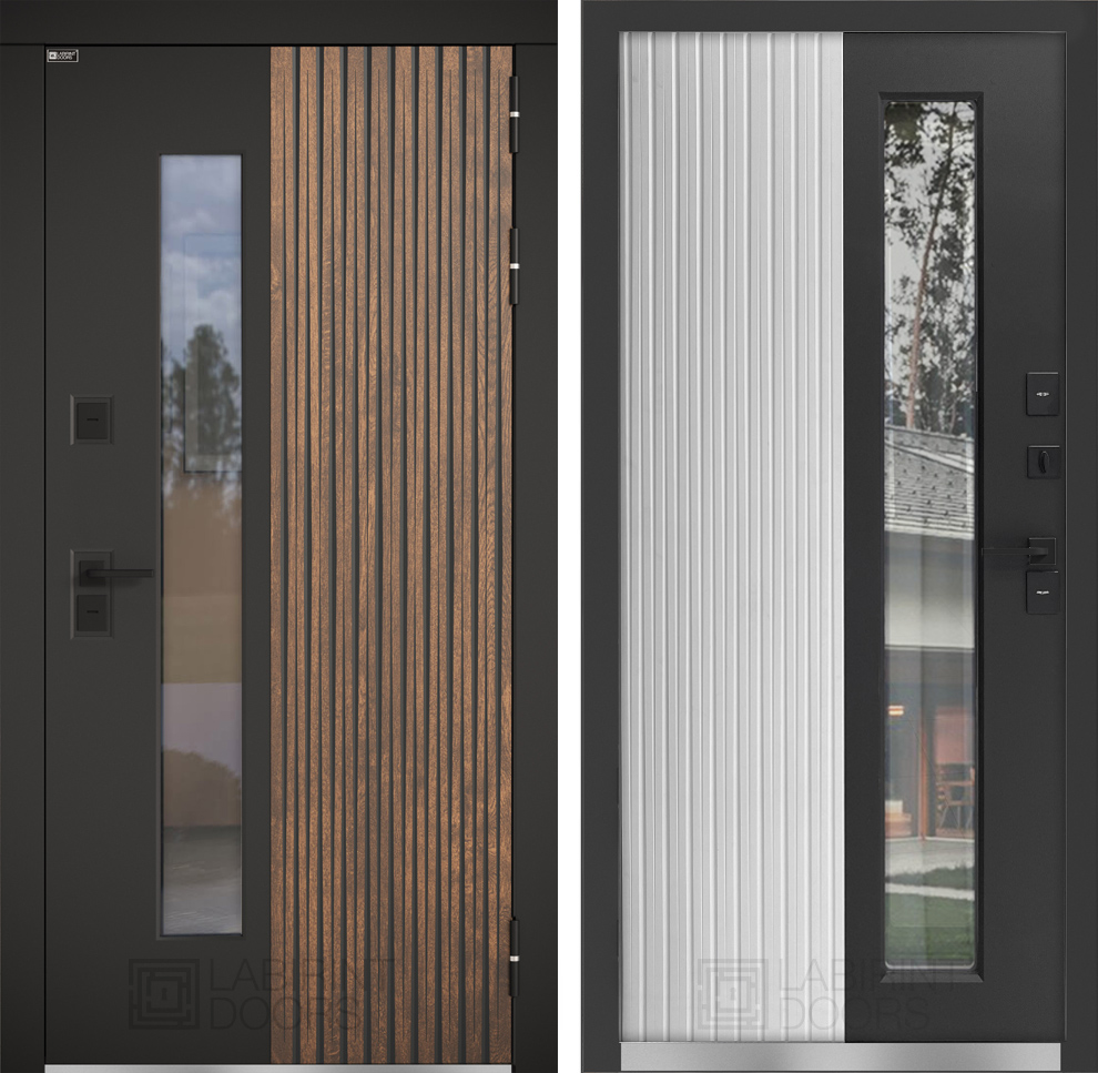 Отделка снаружи: Влагостойкая MDF панель 12 мм комбинированная в цвете «Magic Black silk» и «Орех грецкий» с патиной