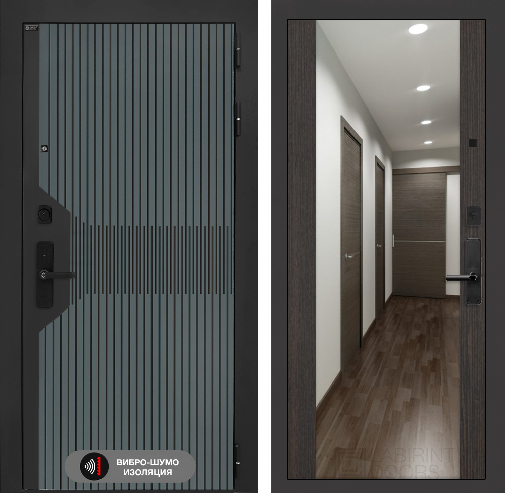 Отделка снаружи: Фрезерованная МДФ панель 10 мм, цвет «Velutto Verde» с патиной и вставкой из металла в цвет наличника