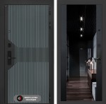 Отделка снаружи: Фрезерованная МДФ панель 10 мм, цвет «Velutto Verde» с патиной и вставкой из металла в цвет наличника