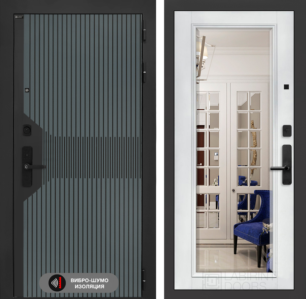 Отделка снаружи: Фрезерованная МДФ панель 10 мм, цвет «Velutto Verde» с патиной и вставкой из металла в цвет наличника