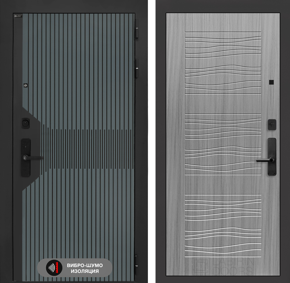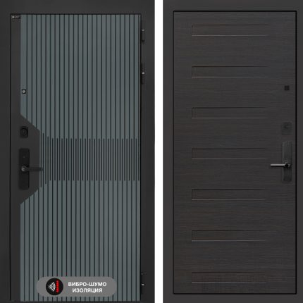 Отделка снаружи: Фрезерованная МДФ панель 10 мм, цвет «Velutto Verde» с патиной и вставкой из металла в цвет наличника