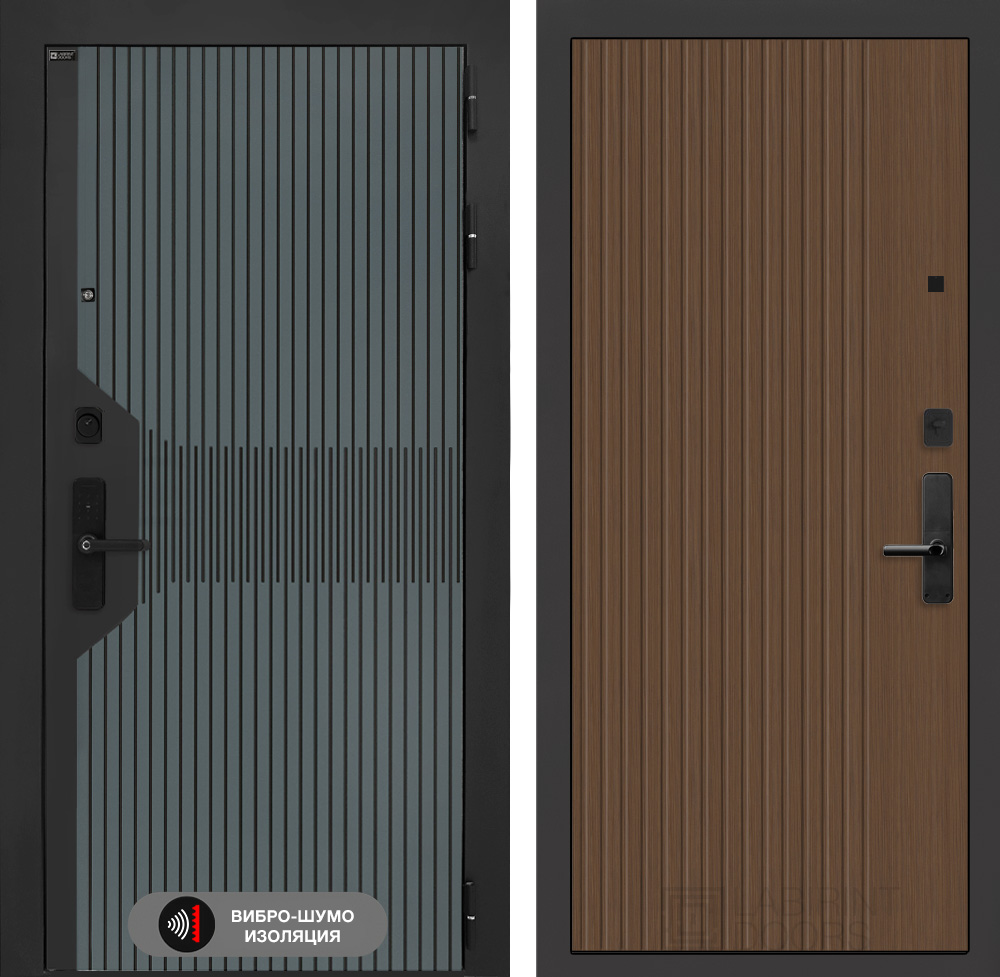 Отделка снаружи: Фрезерованная МДФ панель 10 мм, цвет «Velutto Verde» с патиной и вставкой из металла в цвет наличника