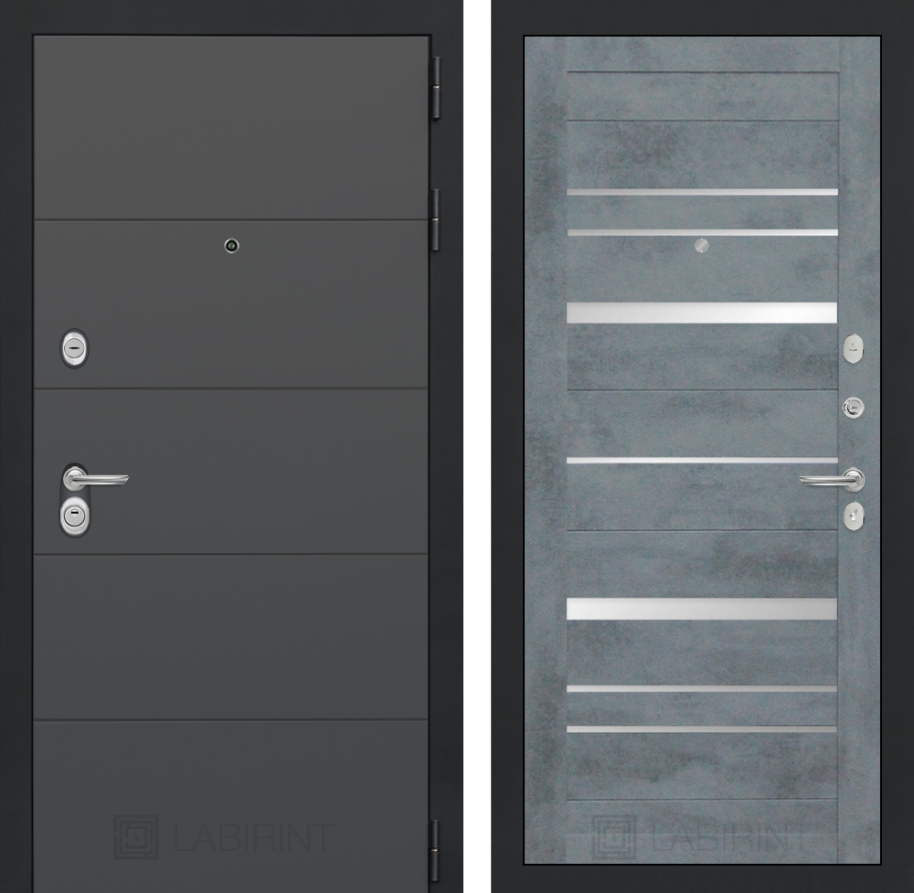 Отделка снаружи: Современная декоративная MDF панель 10 мм, цвет «Графит софт» с металлическим наличником, цвет покраски металла «Муар» серый с блестками