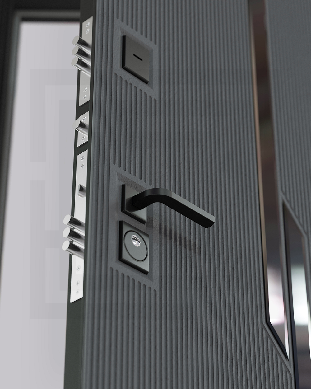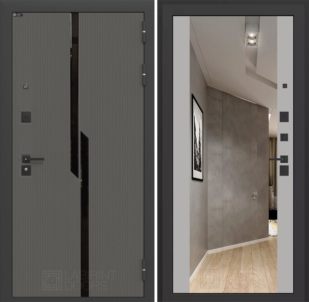 Отделка снаружи: Декоративная MDF панель 10 мм с черным стеклом фацет, цвет «Лофт графит» с металлическим наличником