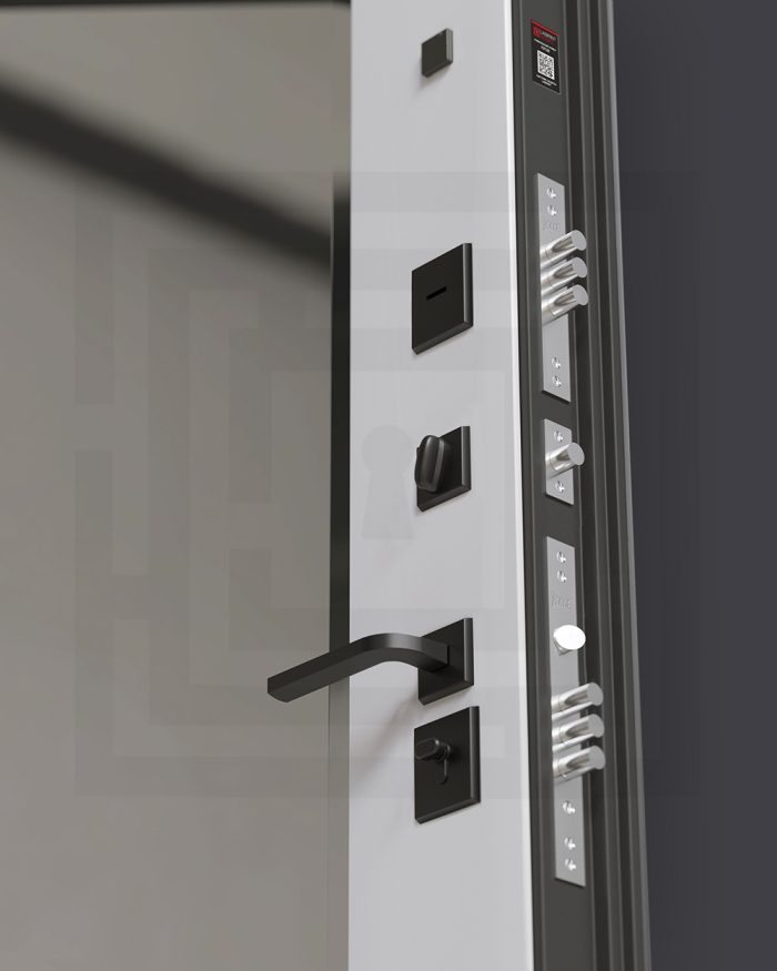 Полный комплект=’Фурнитура в черном цвете: Броненакладка врезная, накладка со шторкой, глазок , дверная ручка, ночная задвижка. Цилиндр ключ-вертушка (производитель не регламентируется), регулируемый эксцентрик.’