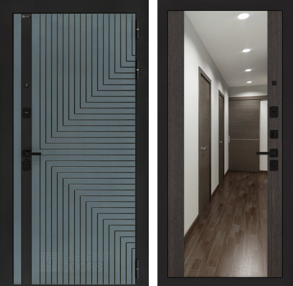 Отделка снаружи: Фрезерованная МДФ панель 10 мм, цвет «Velutto Verde» с патиной и вставкой из металла в цвет наличника