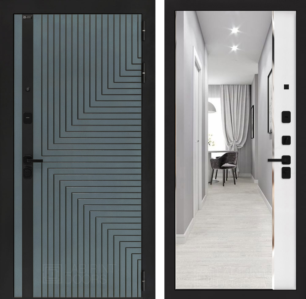 Отделка снаружи: Фрезерованная МДФ панель 10 мм, цвет «Velutto Verde» с патиной и вставкой из металла в цвет наличника