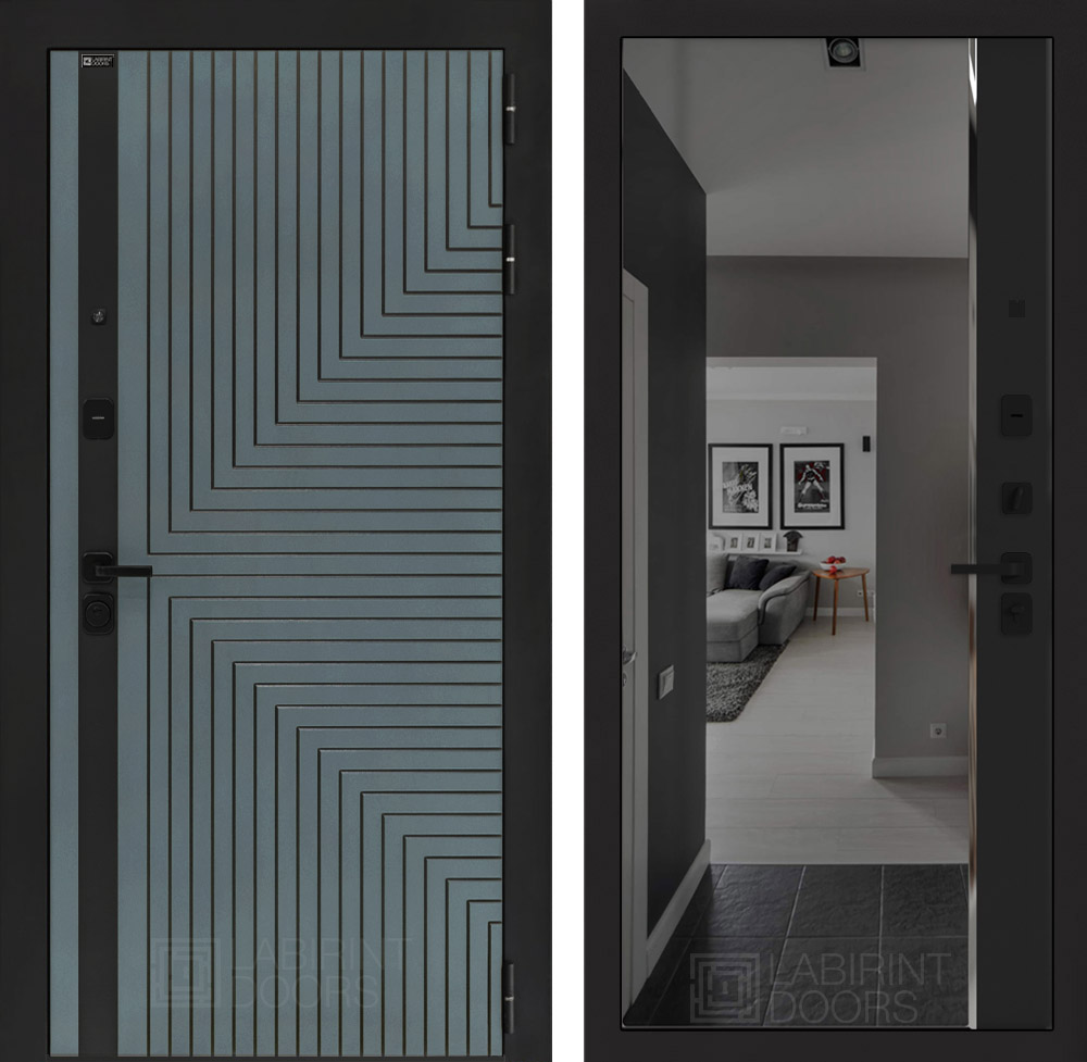 Отделка снаружи: Фрезерованная МДФ панель 10 мм, цвет «Velutto Verde» с патиной и вставкой из металла в цвет наличника