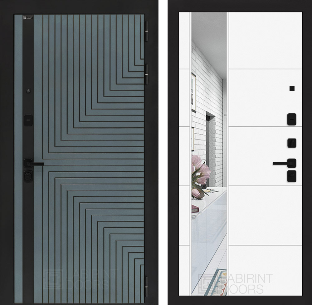 Отделка снаружи: Фрезерованная МДФ панель 10 мм, цвет «Velutto Verde» с патиной и вставкой из металла в цвет наличника