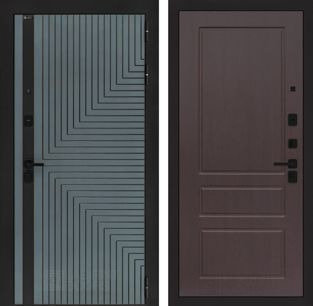 Отделка снаружи: Фрезерованная МДФ панель 10 мм, цвет «Velutto Verde» с патиной и вставкой из металла в цвет наличника