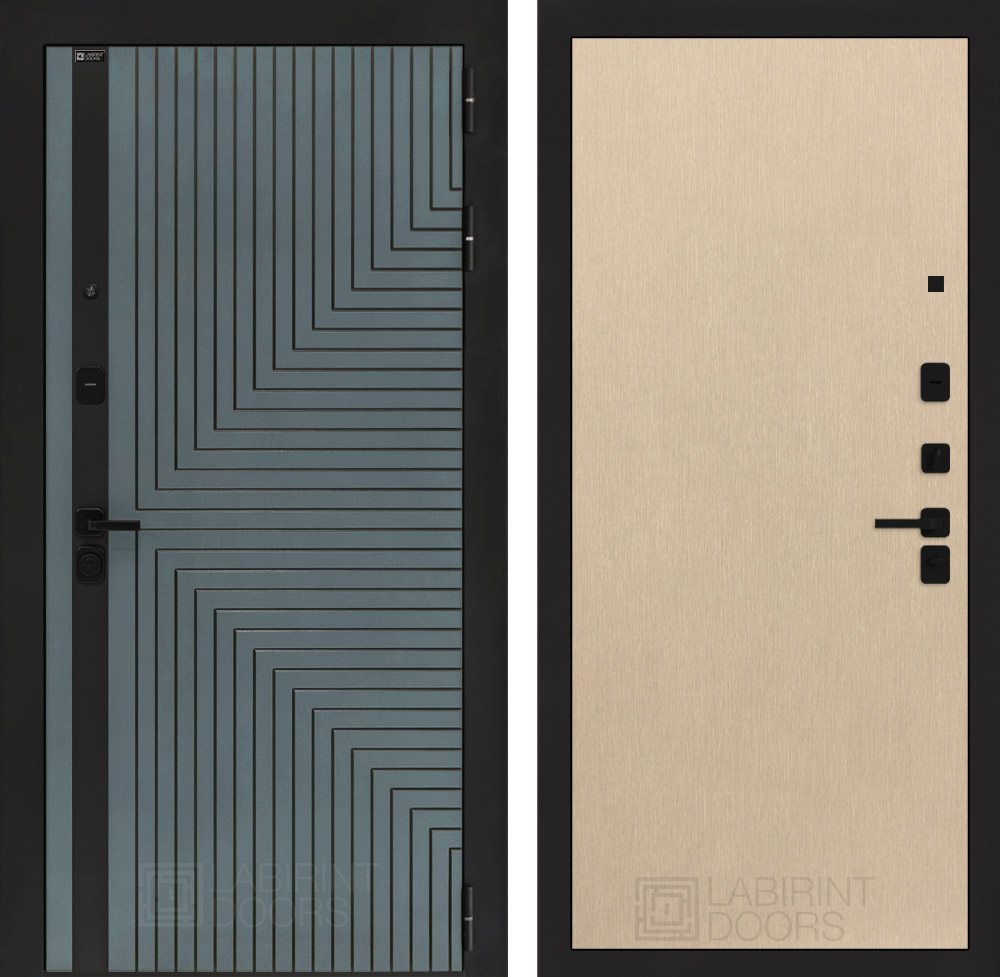 Отделка снаружи: Фрезерованная МДФ панель 10 мм, цвет «Velutto Verde» с патиной и вставкой из металла в цвет наличника