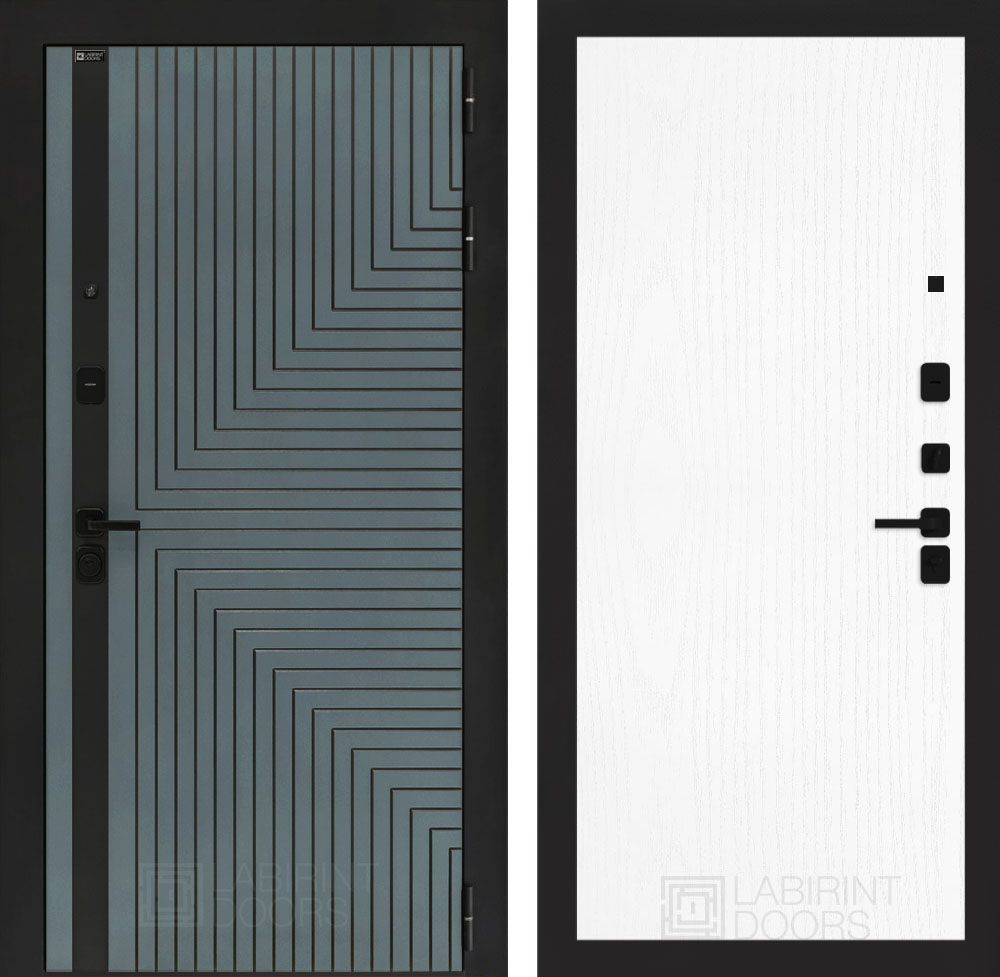 Отделка снаружи: Фрезерованная МДФ панель 10 мм, цвет «Velutto Verde» с патиной и вставкой из металла в цвет наличника