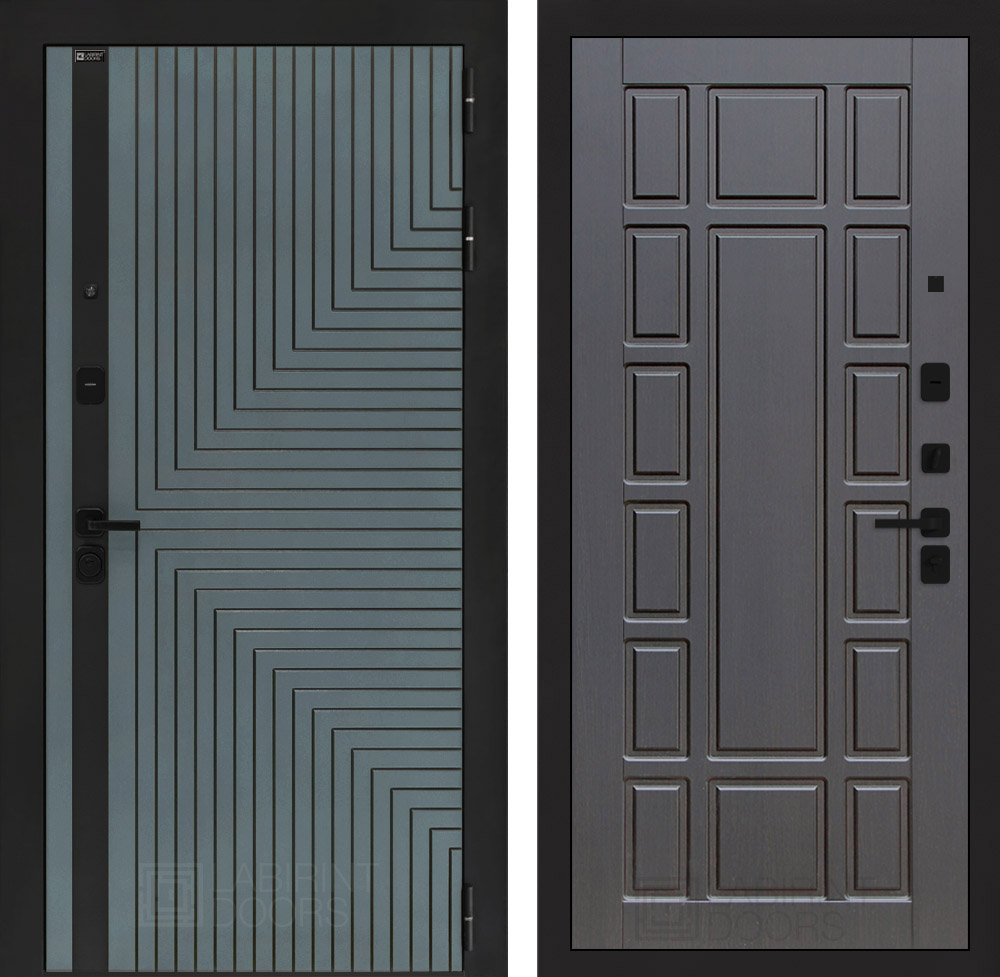 Отделка снаружи: Фрезерованная МДФ панель 10 мм, цвет «Velutto Verde» с патиной и вставкой из металла в цвет наличника