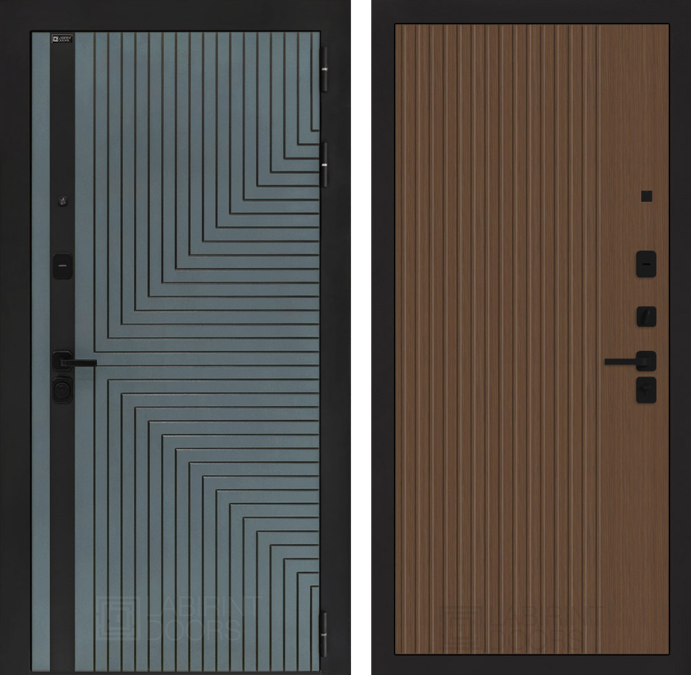 Отделка снаружи: Фрезерованная МДФ панель 10 мм, цвет «Velutto Verde» с патиной и вставкой из металла в цвет наличника