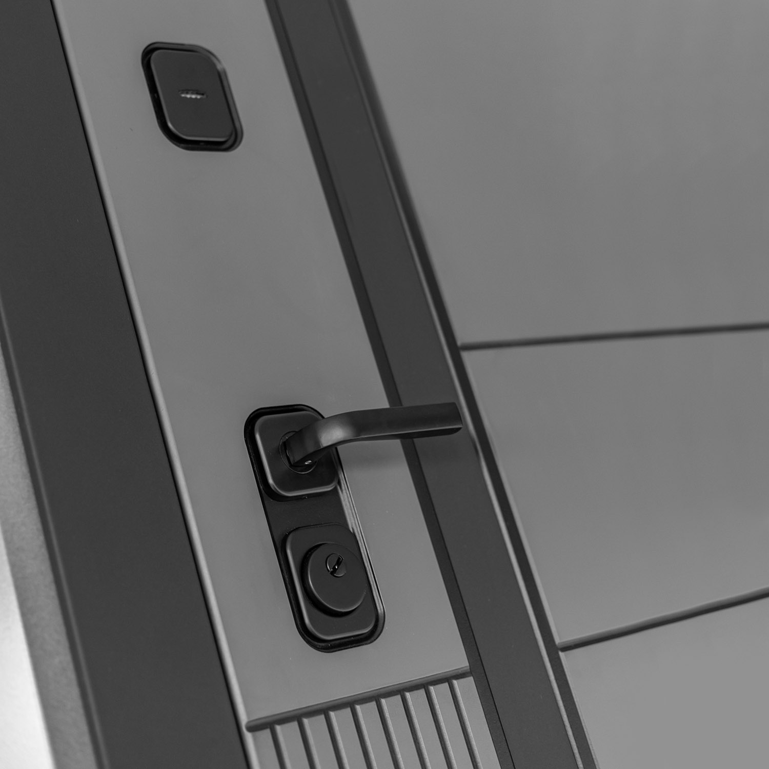 Полный комплект: Фурнитура в черном цвете: Броненакладка врезная, накладка со шторкой, глазок , дверная ручка, ночная задвижка. Цилиндр ключ-вертушка (производитель не регламентируется), регулируемый эксцентрик.