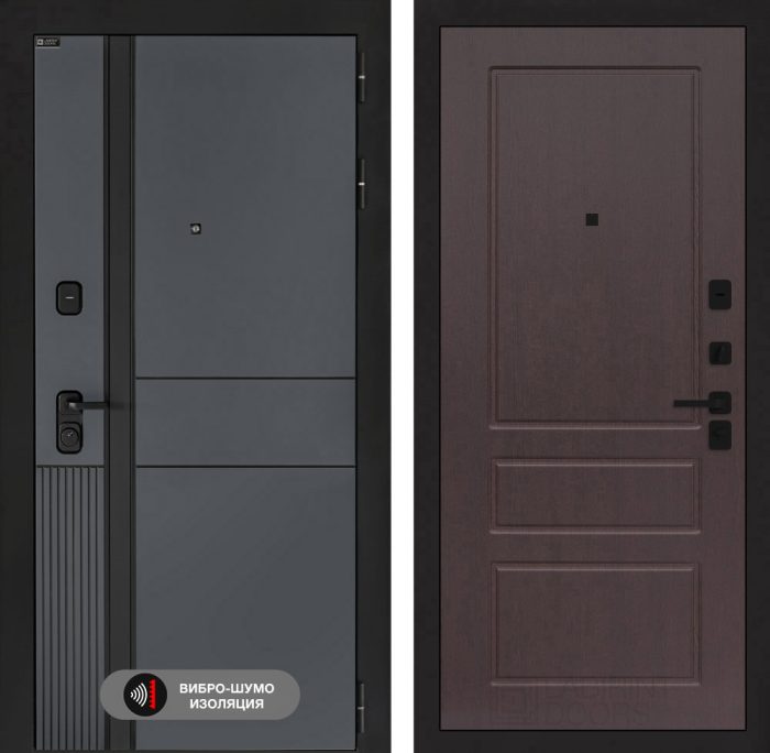 Отделка снаружи=’Фрезерованная МДФ панель 10 мм, цвет «Velluto Oscuro» с патиной и вставкой из металла в цвет наличника’