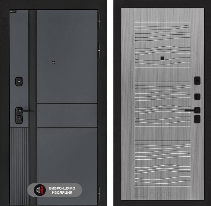 Отделка снаружи=’Фрезерованная МДФ панель 10 мм, цвет «Velluto Oscuro» с патиной и вставкой из металла в цвет наличника’