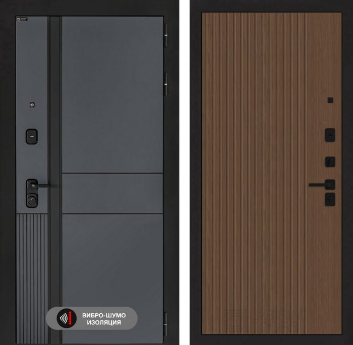 Отделка снаружи=’Фрезерованная МДФ панель 10 мм, цвет «Velluto Oscuro» с патиной и вставкой из металла в цвет наличника’