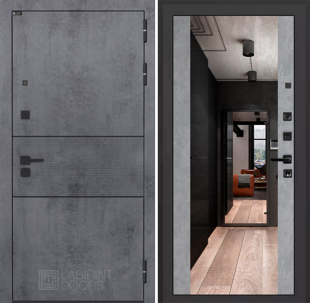 Отделка снаружи: Современная MDF панель 10 мм с наличником, цвет «Бетон темный», вставка черный молдинг