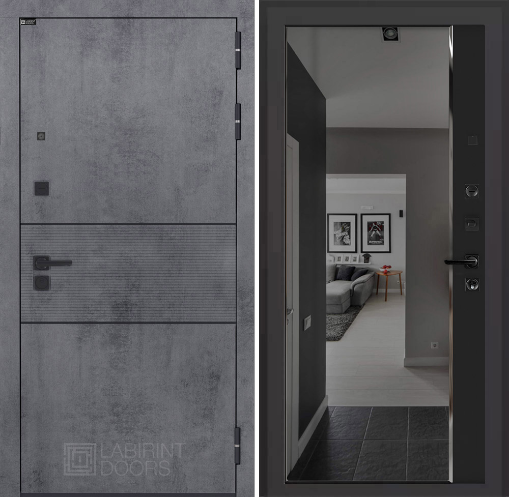 Отделка снаружи: Современная MDF панель 10 мм с наличником, цвет «Бетон темный», вставка черный молдинг