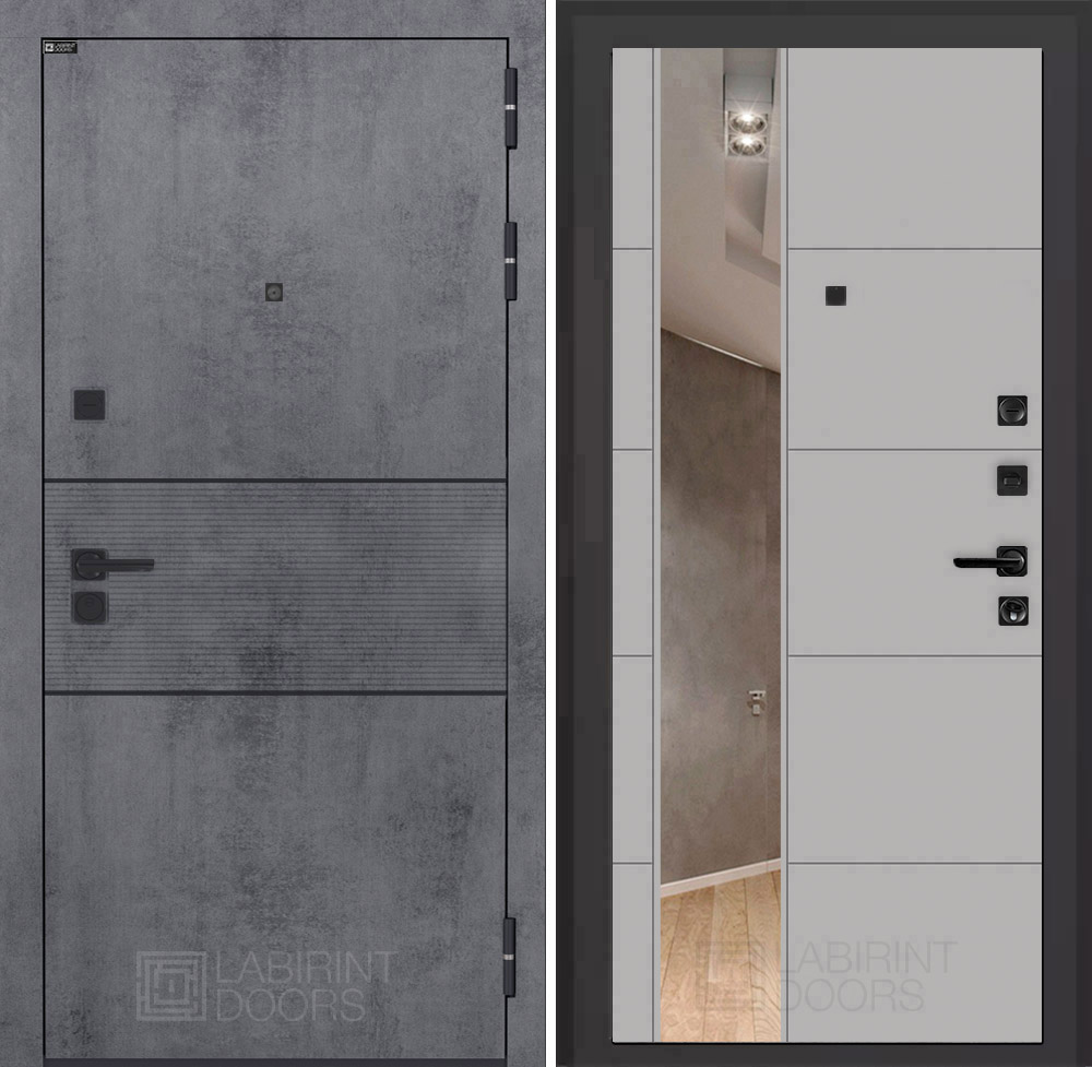 Отделка снаружи: Современная MDF панель 10 мм с наличником, цвет «Бетон темный», вставка черный молдинг