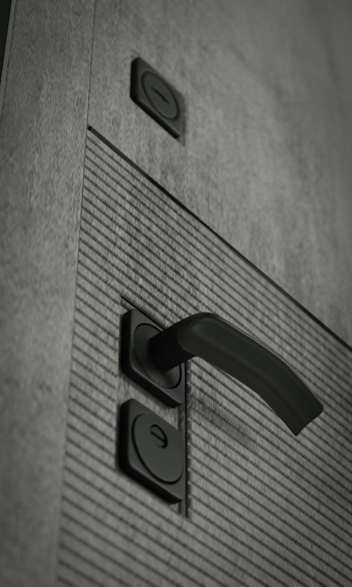 Полный комплект=’Фурнитура в черном цвете: Броненакладка врезная, накладка со шторкой, глазок , дверная ручка, ночная задвижка. Цилиндр ключ-вертушка (производитель не регламентируется), регулируемый эксцентрик.’