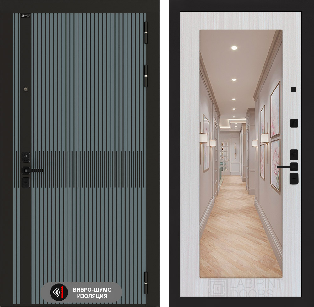 Отделка снаружи: Фрезерованная МДФ панель 10 мм, цвет «Velutto Verde» с патиной и вставкой из металла в цвет наличника
