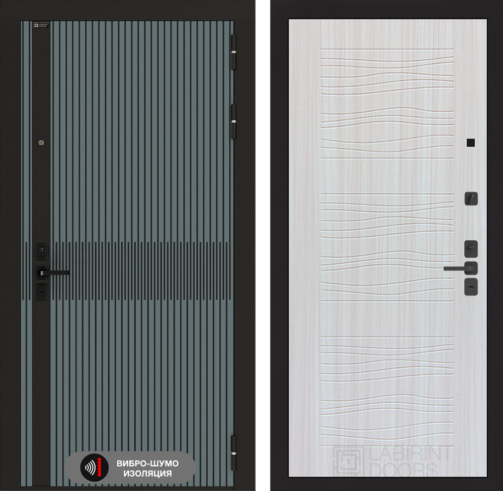 Отделка снаружи: Фрезерованная МДФ панель 10 мм, цвет «Velutto Verde» с патиной и вставкой из металла в цвет наличника