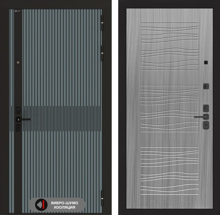Отделка снаружи=’Фрезерованная МДФ панель 10 мм, цвет «Velutto Verde» с патиной и вставкой из металла в цвет наличника’