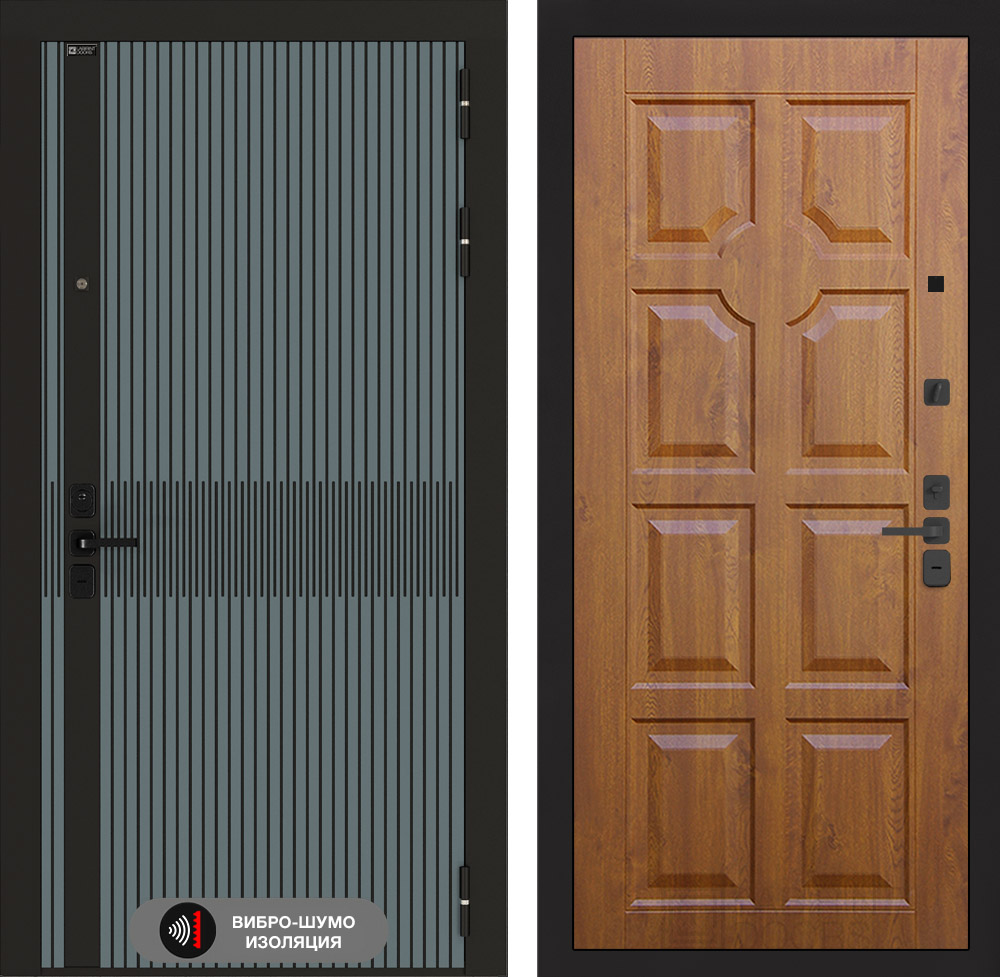 Отделка снаружи: Фрезерованная МДФ панель 10 мм, цвет «Velutto Verde» с патиной и вставкой из металла в цвет наличника
