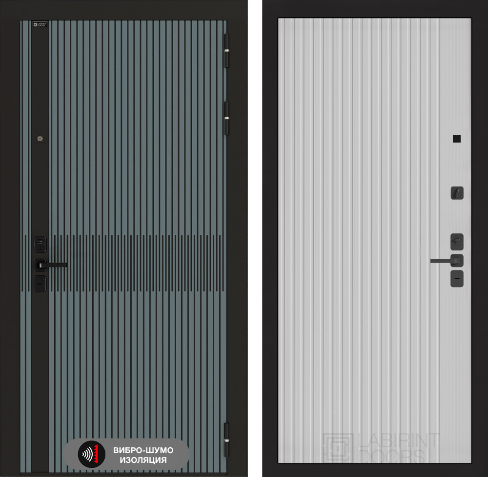 Отделка снаружи: Фрезерованная МДФ панель 10 мм, цвет «Velutto Verde» с патиной и вставкой из металла в цвет наличника
