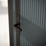 Отделка снаружи: Фрезерованная МДФ панель 10 мм, цвет «Velutto Verde» с патиной и вставкой из металла в цвет наличника