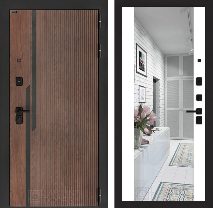 Отделка снаружи=’Фрезерованная МДФ панель 10 мм, цвет «Орех американский» с патиной и вставками из металла в цвет наличника’