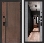 Отделка снаружи: Фрезерованная МДФ панель 10 мм, цвет «Орех американский» с патиной и вставками из металла в цвет наличника