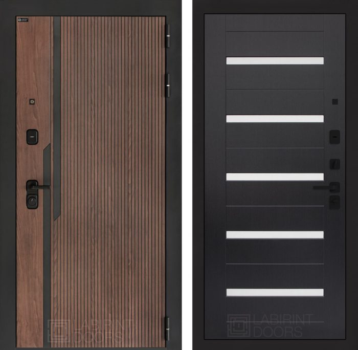 Отделка снаружи=’Фрезерованная МДФ панель 10 мм, цвет «Орех американский» с патиной и вставками из металла в цвет наличника’