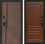 Отделка снаружи: Фрезерованная МДФ панель 10 мм, цвет «Орех американский» с патиной и вставками из металла в цвет наличника