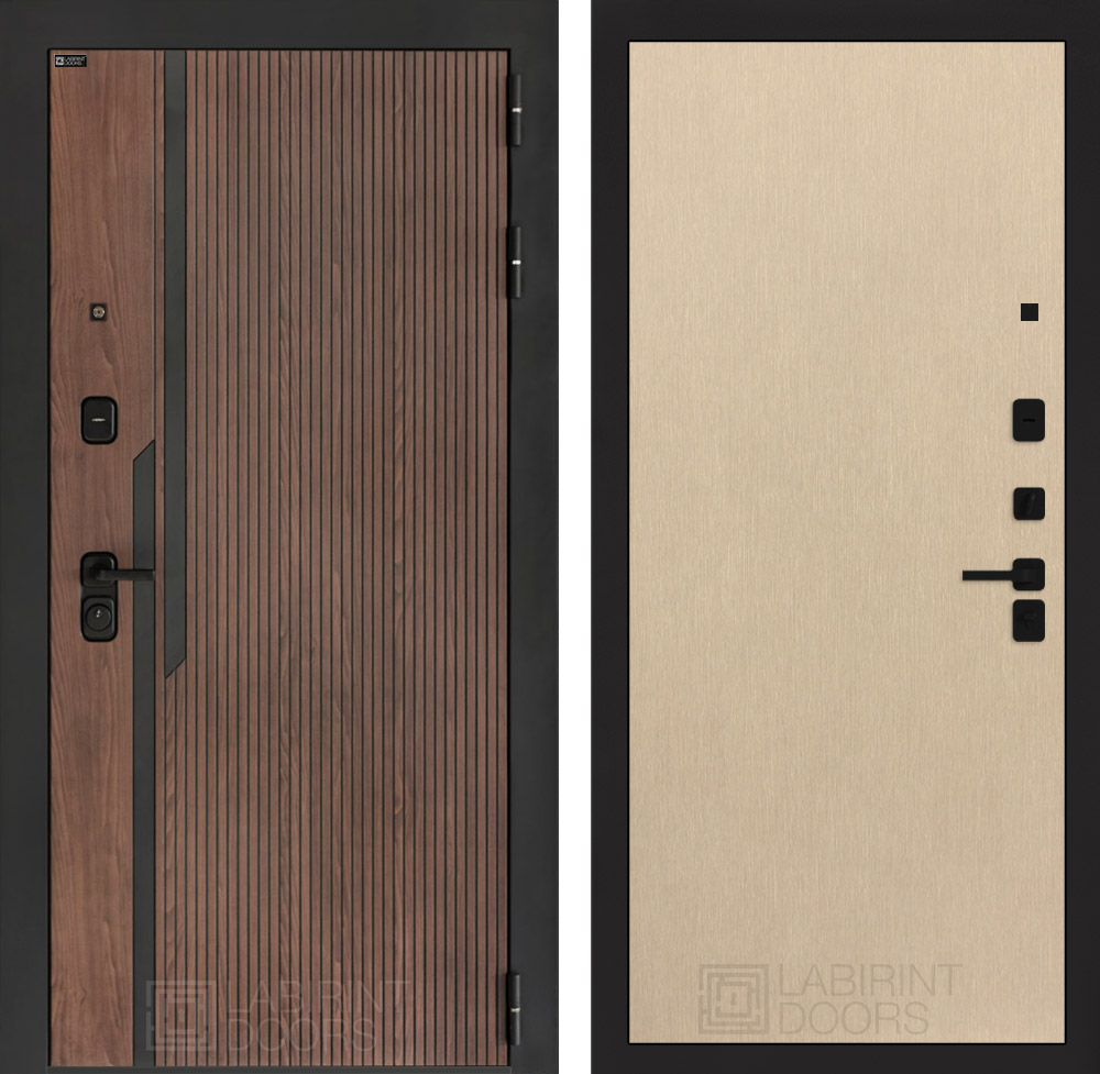 Отделка снаружи: Фрезерованная МДФ панель 10 мм, цвет «Орех американский» с патиной и вставками из металла в цвет наличника