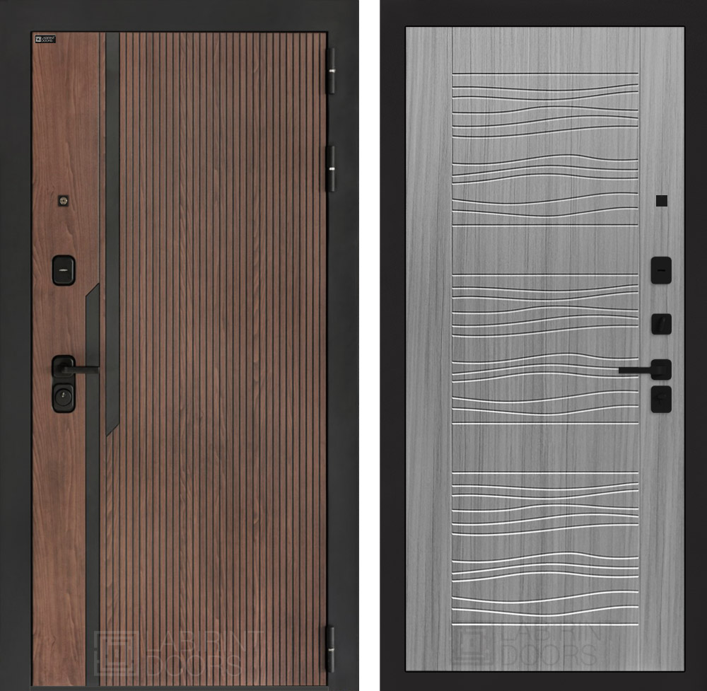 Отделка снаружи: Фрезерованная МДФ панель 10 мм, цвет «Орех американский» с патиной и вставками из металла в цвет наличника