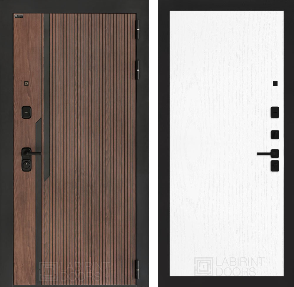 Отделка снаружи: Фрезерованная МДФ панель 10 мм, цвет «Орех американский» с патиной и вставками из металла в цвет наличника
