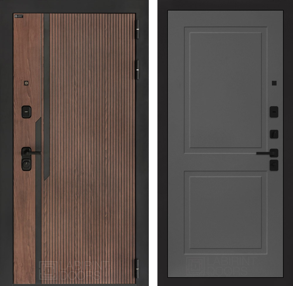 Отделка снаружи: Фрезерованная МДФ панель 10 мм, цвет «Орех американский» с патиной и вставками из металла в цвет наличника