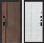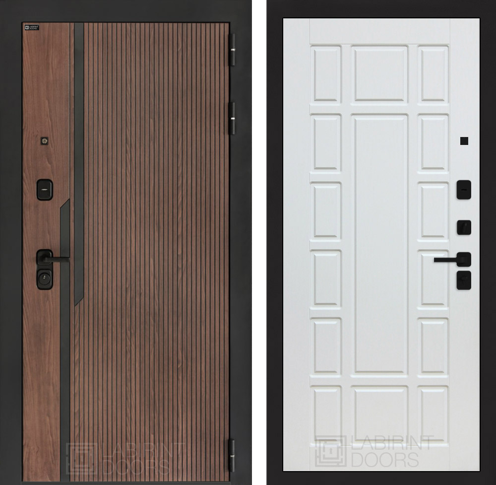 Отделка снаружи: Фрезерованная МДФ панель 10 мм, цвет «Орех американский» с патиной и вставками из металла в цвет наличника