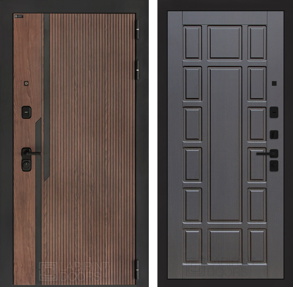 Отделка снаружи: Фрезерованная МДФ панель 10 мм, цвет «Орех американский» с патиной и вставками из металла в цвет наличника